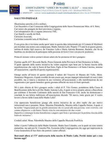 Lettera di saluto a una suora. Come Rivolgersi ai Membri del Clero Cattolico - wikiHow Su carta ci si può rivolgere a lui come "Sua Eccellenza Reverendissima, (Nome e Cognome), Vescovo di (Località)", o S.E.R. Ricorda che bisogna alzarsi quando entra in una stanza (fin quando non ti invita a sedere) e quando esce. Devi togliere il cappello in sua presenza, e baciargli l'anello quando lo saluti all'arrivo e all'accomiato. Come Indirizzare una Lettera a un Prete: 11 Passaggi - wikiHow Il saluto dovrebbe essere: "Reverendo Frate" seguito dal cognome. Per concludere la lettera, puoi semplicemente annotare queste parole: "La prego di accogliere, Reverendo Frate, l'espressione dei miei sentimenti deferenti" e poi il tuo nome e cognome. Se devi scrivere a una suora, annota queste parole sulla busta: "Reverenda Suora (nome e ... DOC Saluti E Ringraziamenti - Diocesi Di Trivento Saluto di ringraziamento a S. E mons. ANTONIO SANTUCCI Carissimo confratello, domenica 20 novembre 2005, ore 16.30, l'intera nostra Diocesi è convocata a Canneto, nel Santuario della Madonna del Sorriso, per la Concelebrazione eucaristica e una gioiosa manifestazione di gratitudine a S. E. Rev.ma Mons. PDF Saluto Alle Suore Della Carità SALUTO ALLE SUORE DELLA CARITÀ DI S. GIOVANNA ANTIDA THOURET . Sett 2016 LA PAROLA A DON SIMONE "Dio solo". Due parole che esprimono il gusto di tutta una vita, quella di santa iovanna Antida e della storia che io ha voluto che nascesse dal suo "sì". A volte, però, la Provvidenza impedisce che le parole rimangano tali e