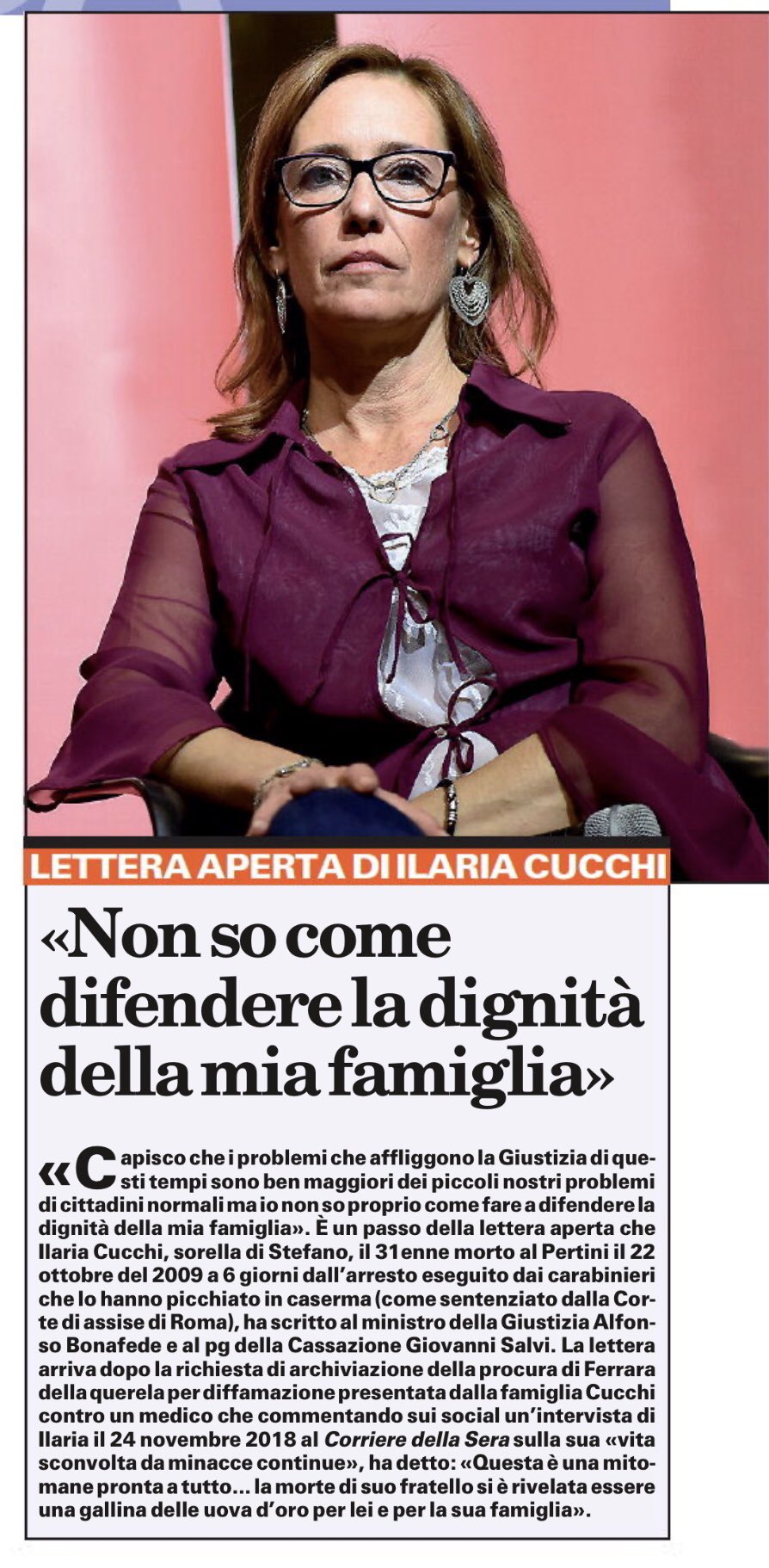 › lettera-aperta-a-ilariaLettera aperta a Ilaria Cucchi e alla sua famiglia Lettera aperta a Ilaria Cucchi e alla sua famiglia. Ilaria, sorella di Antigone. Lettera aperta a Ilaria Cucchi, nel giorno della morta della madre. come vorrei che queste mie parole arrivassero a te, a essere lette dai tuoi occhi buoni. › scheda › 680741Rassegna stampa vaticana (16.10.2022) Partecipano: Ilaria Cucchi, senatrice Alleanza Verdi e Sinistra, prima firmataria; Peppe De Cristofaro, Capogruppo di Alleanza Verdi e Sinistra e Presidente del gruppo Misto del Senato e Fabio ...