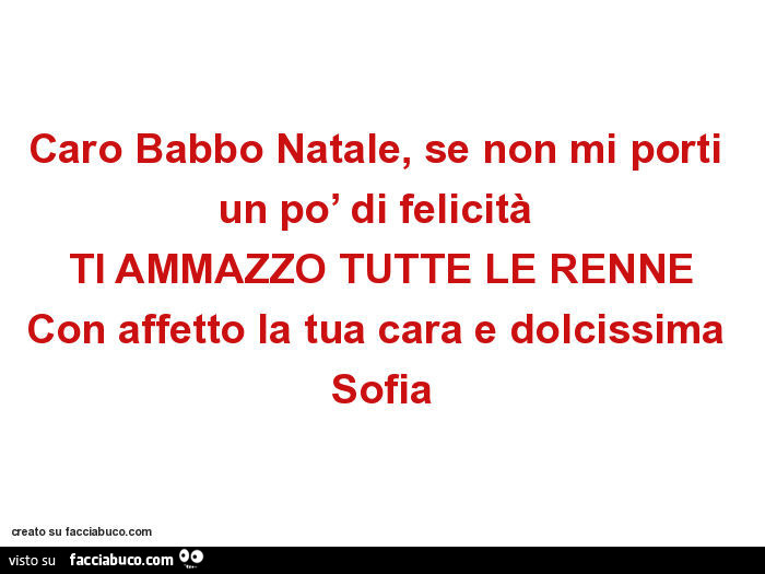Lettera a babbo natale portami un treno di felicità. significatocanzone.it › testoTesti e significati delle canzoni disponibili | Significato ... Elenco di canzoni, testi e significati. Significato Canzone, allo stesso modo di Wikipedia, è costruito attraverso il libero contributo delle persone che possono chiedere il significato delle canzoni, esprimere il proprio punto di vista sull'interpretazione del testo ed annotare i singoli versi delle canzoni. Poesie e Filastrocche - L'Angelo e la Strega - ForumFree ... c'e' un gran lavoro. Arrivano lettere da ogni paese, ogni bambino non bada a spese, ... Filastrocca di Babbo Natale, portami un dono davvero speciale! LA FAVOLA DI NATALE di Giovanni GUARESCHI - Dr Vicla Sgaravatti Dec 16, 2021 ... “Portami nel Paese dov'è adesso il papà del mio bambino”, disse la ... Era proprio Babbo Natale, tutto vestito di rosso e con una gran barba ... Caro Babbo Natale, portami... - YouTube Dec 22, 2015 ... Avete scritto la letterina a Babbo Natale? Molti bambini lo hanno fatto. Poste Italiane ha installato delle buche delle lettere per ...