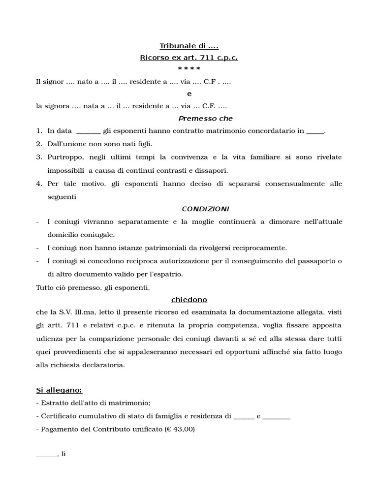 Separazione consensuale: come si fa, modello, costi e tempi - Money.it Ecco un modello fac-simile di ricorso per separazione consensuale in tribunale: Modello fac-simile separazione consensuale Separazione consensuale, serve l'avvocato? L'avvocato è sempre obbligatorio quando la coppia ha uno o più figli minor i oppure maggiorenni ma affetti da handicap o non economicamente autosufficienti.