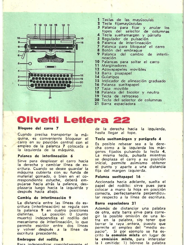 Olivetti lettera 32 manuale italiano. Matera - Wikipedia La Gravina. La città si trova nella parte orientale della regione Basilicata a 401 m s.l.m., al confine con la parte sud-occidentale della città metropolitana di Bari (con i comuni di Altamura, Gravina in Puglia e Santeramo in Colle) e l'estrema parte nord-occidentale della provincia di Taranto (con i comuni di Ginosa e Laterza). Lucca Comics & Games - Wikipedia Visitatori in Via Vittorio Veneto durante l'ultimo giorno dell'edizione 2007. Lucca Comics & Games è una fiera internazionale dedicata al fumetto, all'animazione, ai giochi (di ruolo, da tavolo, di carte), ai videogiochi e all'immaginario fantasy e fantascientifico, che si svolge a Lucca in Toscana, nei giorni tra fine ottobre e inizio novembre. È considerata la più importante rassegna ... E-book - Wikipedia Tecnologia. Per la lettura di un libro elettronico sono necessari diversi componenti: il documento elettronico di partenza o e-text, in un formato elettronico ( eBook format) come ad esempio l'ePub o altri formati Olivetti - Wikipedia Olivetti Lettera 50/51/52: 1980 Portatile Antonio Macchi Cassia. Mario Bellini. bianco con coperchio nero la serie 50 utilizza il nastro in cartuccia al posto del nastro bicolore con bobine Olivetti Lettera 62: 198x Portatile Marcello Nizzoli: rosso meccanicamente derivata dalla Lettera 32. Prodotta in Jugoslavia. 43 tasti Olivetti Lettera 82: ...